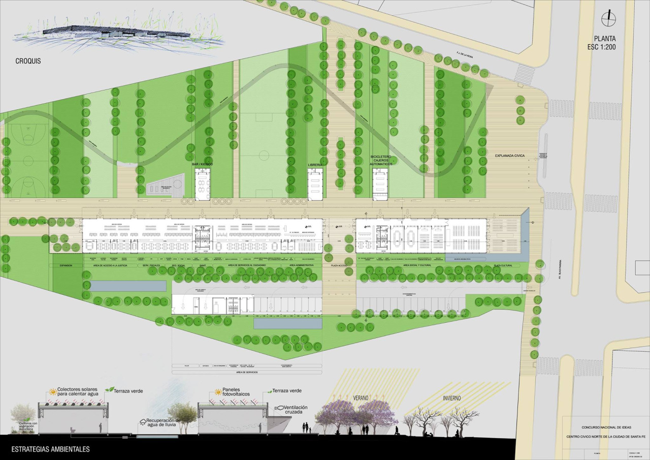 La disposición de programas y el planteo funcional del edificio puede ser leído como un eco tipológico de la vieja casa urbana de principios de siglo XX en Argentina, popularmente conocida como “casa chorizo”. Se trata, quizás, de una revisión moderna de los conceptos positivos que dieron origen a aquella tipología. La galería da acceso y protección a los locales del edificio, que asimismo están conectados internamente por una circulación. Casi como aquellas versiones más populares, con el servicio al exterior, nuestro edificio plantea los servicios más “sucios” en un volumen aparte.El edificio central se divide en dos partes: una aloja el equipamiento cultural que el programa requiere. Posee entrada independiente y puede ser utilizado fuera de horario de oficina. Se encuentra ubicado en el área de mayor accesibilidad y visibilidad.El sector de oficinas y atención al público, se estructura en torno al hall-circulación en relación a la galería y el parque, y se plantea como un área de oficinas abiertas, con máximo aprovechamiento de la iluminación natural y el desaliento a la división por tabiques que puedan afectar la continuidad espacial.Un segundo edificio, morfológicamente diferenciado del primero, aloja los servicios: estacionamientos semi cubiertos, vestuarios, sala de máquinas y taller.Finalmente, a modo de pabellones en el parque, y como si fueran pequeños botes que trasladan a los usuarios hacia tierra, aparecen tres equipamientos que enfatizan la apropiación del edificio sobre el espacio verde.