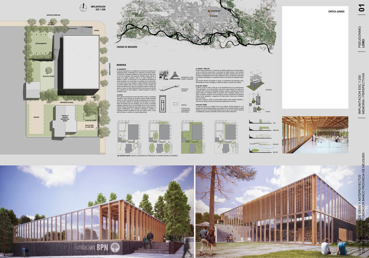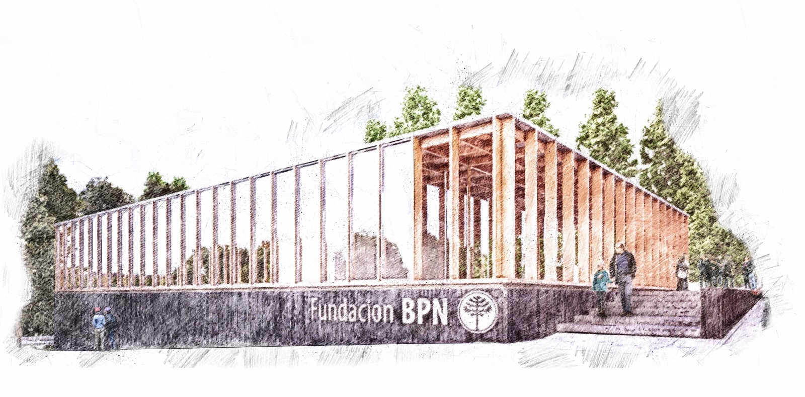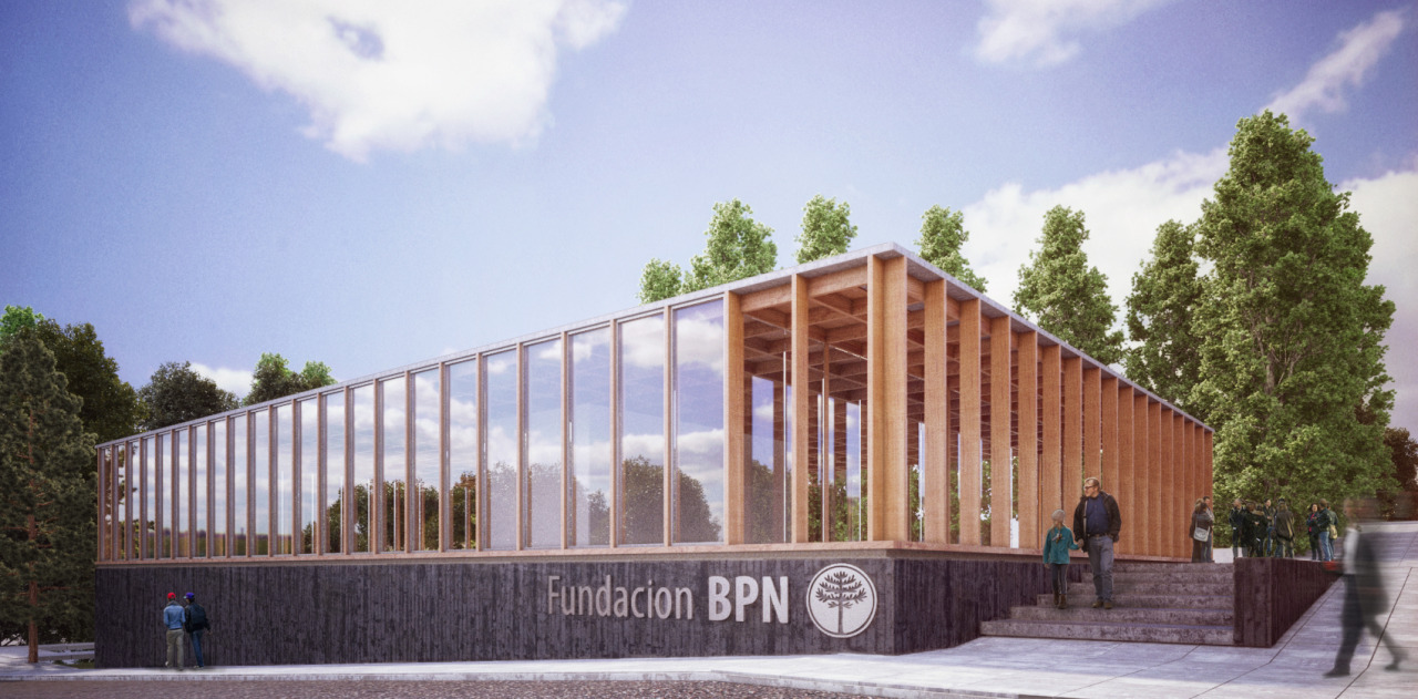 El edificio se abre al oeste a través de un hall longitudinal hacia lo que denominamos “Plaza del Pehuén”, en el terreno lindero. Será ése el corazón exterior de la Sede de la Fundación BPN, escenario de actividades artísticas, sociales y culturales que harán del espacio público el verdadero ámbito de encuentro que la Fundación propone. En su centro, se plantará un pehuén que será testigo en su lento crecimiento de la expresión artística de los ciudadanos, y comprometerá una mirada hacia el futuro que la Fundación ayuda a construir. Esta plaza, asimismo, tendrá un acceso directo desde la calle Antártida Argentina, a través de una escalera que servirá de grada para espectáculos al aire libre, y mediante la plantación de otras especies de árboles, sumadas a las ya existentes, se buscará conformar un microclima que propicie las actividades propuestas, protegiéndose de los vientos y el sol del verano.