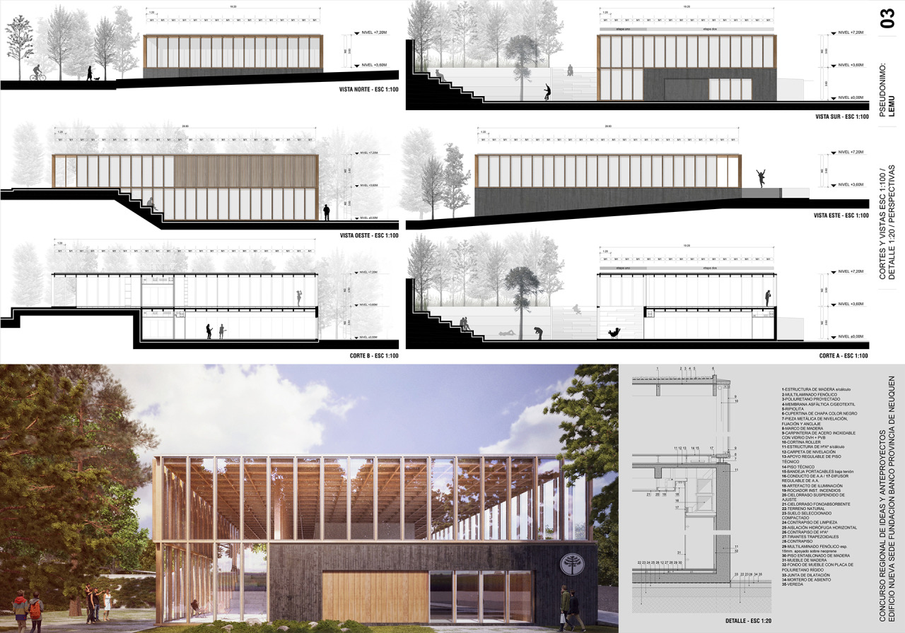 El edificio plantea una serie de estratos que se posan, uno a uno, sobre el soporte natural del terreno. El primero es el basamento-cueva materializado con tecnologías húmedas: un hormigón armado a modo de monolito con ferrites oscuros que le otorgan mayor absorción térmica y un contraste cromático con aquello que recibe encima, acaso un eco de la roca ígnea de los volcanes que la provincia posee y que la Fundación puede de esta manera traer a la Capital como parábola. La piel-estructura responde a las lógicas de la construcción seca, se trata de un entramado de madera vertical y otro horizontal, que mediante la utilización de tecnologías de laminado permite cubrir la luz libre que flexibiliza los espacios interiores. Este bastidor recibe las carpinterías de acero inoxidable que otorgan las prestaciones necesarias de cerramiento, y resuelve en un módulo único (1,20 metros) su condición sistémica. La cubierta es plana, una membrana de bajo espesor y altas propiedades de resistencia térmica.