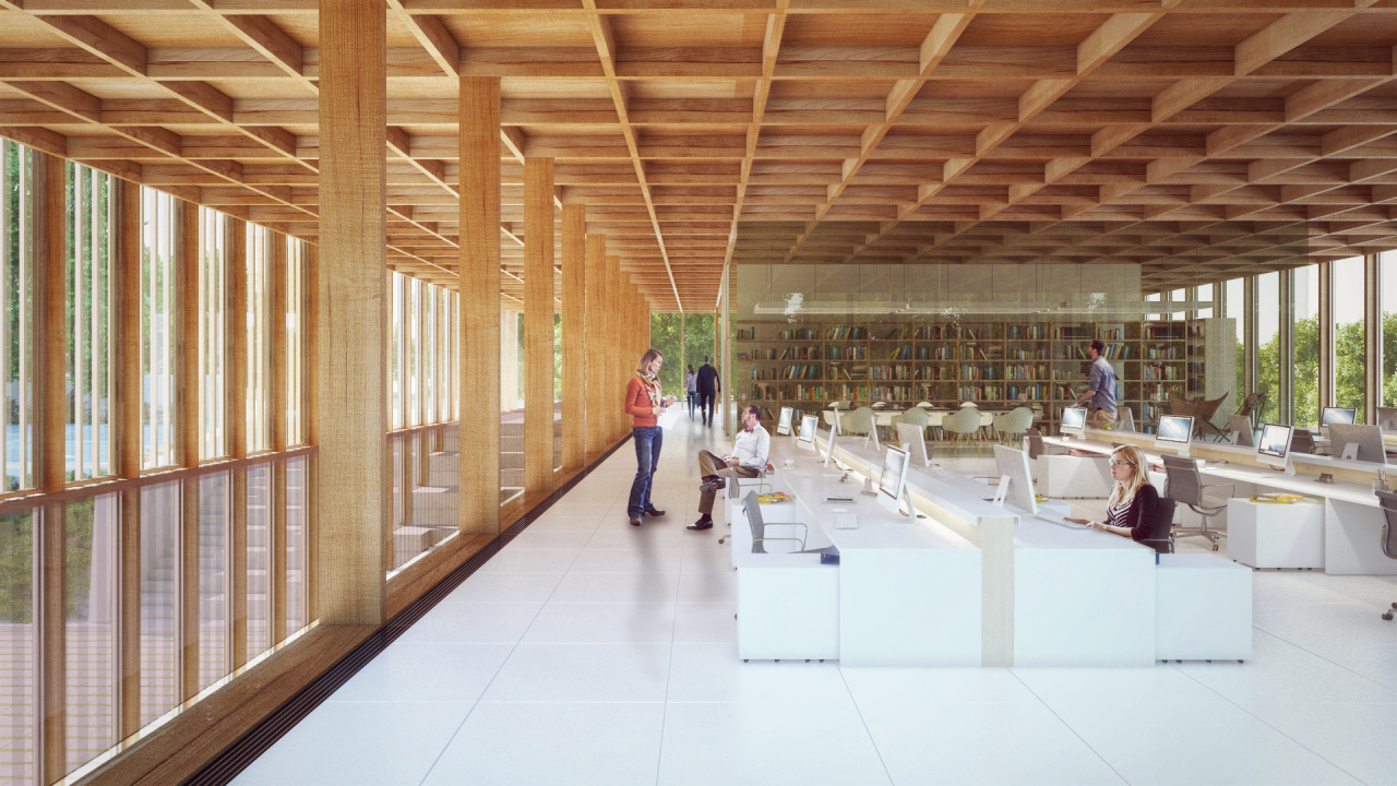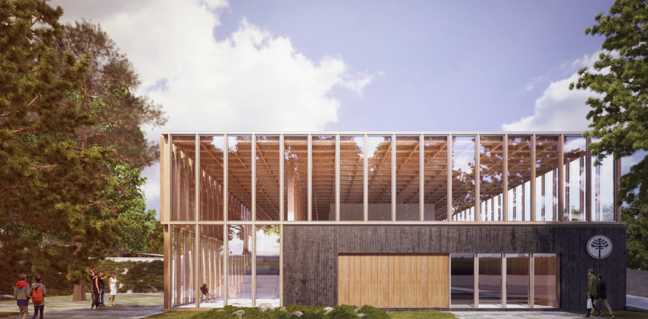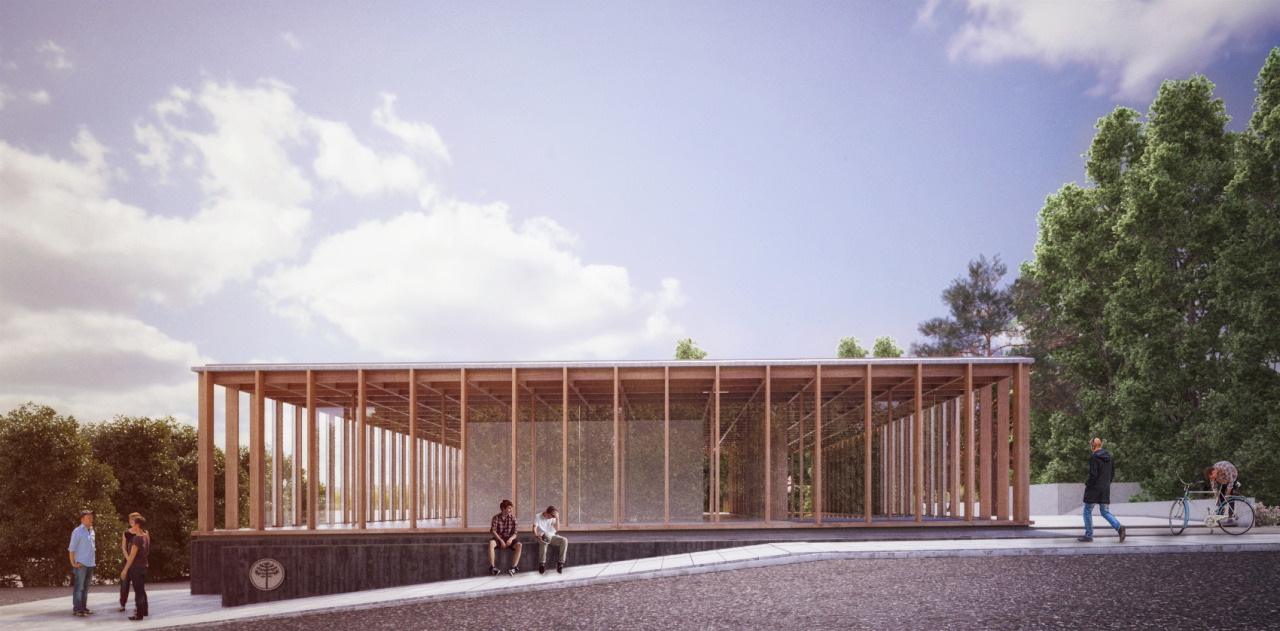Posado sobre el basamento a la manera de los edificios perípteros de la Grecia Clásica, se teje un edificio de origen textil: un entramado de madera vertical y otro horizontal generan la envolvente para el sector administrativo del edificio, bañando de luz las áreas de trabajo y protegiéndose del sol en las orientaciones críticas: un pronaos al norte emula a los templos seudodípteros, a las galerías romanas, a los ranchos de la geografía argentina. Este volumen tectónico del pabellón se opone a la estereotomía del basamento-cueva, identificando morfológica y materialmente las etapas y funciones en el edificio.